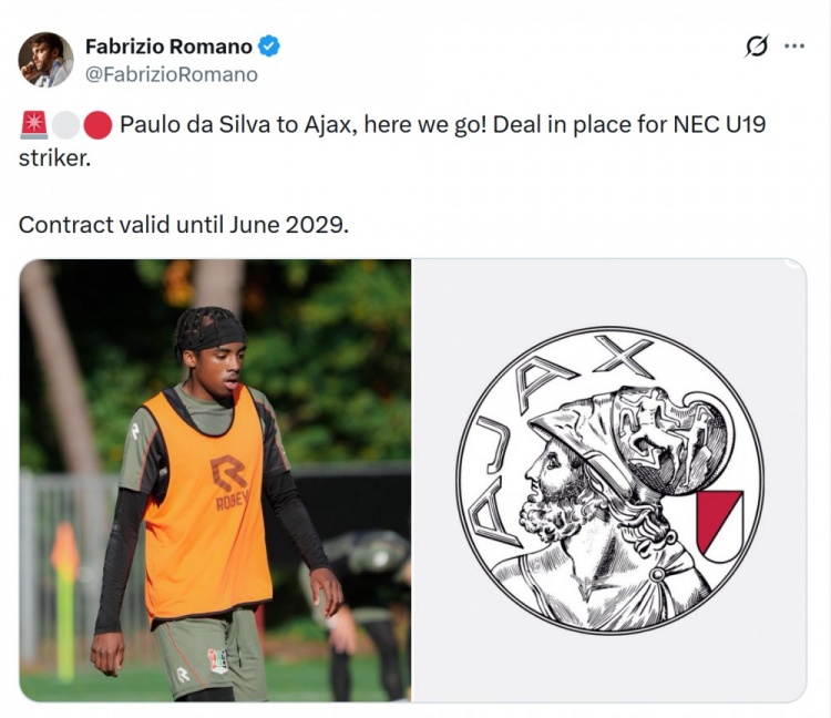 罗马诺透露,阿贾克斯有意引进荷兰前锋保罗·达席尔瓦,已就球员的转会达成协议,将与这位小将签约至2029年。